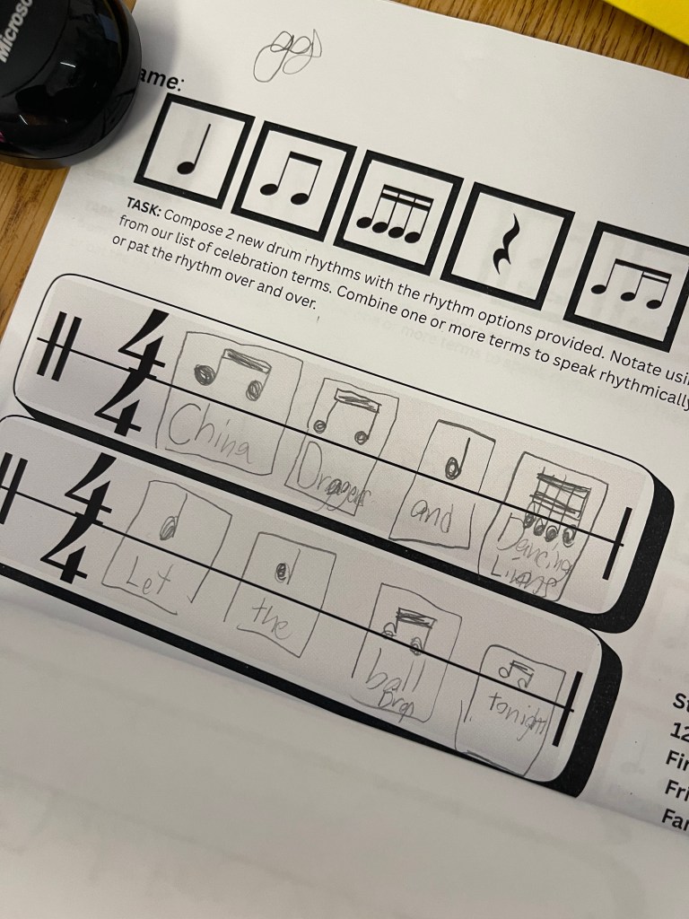 We first immersed ourselves in traditional folk dances singing and dancing with the music. Those songs then became the pathway to creativity. Each class composed their own song lyrics to pair with a previously learned rhyme. They extended the piece with chosen words to create ostinato patterns and performed as a class and in small groups. Much of our time was spent utilizing the xylophones available in class. Students removed certain bars and explored syncopated rhythms and melody from on of the folk dances. Then expanded from that melody by composing their own melody with the same rhythms in various combinations.