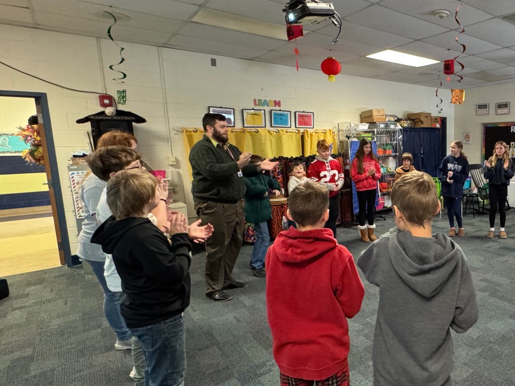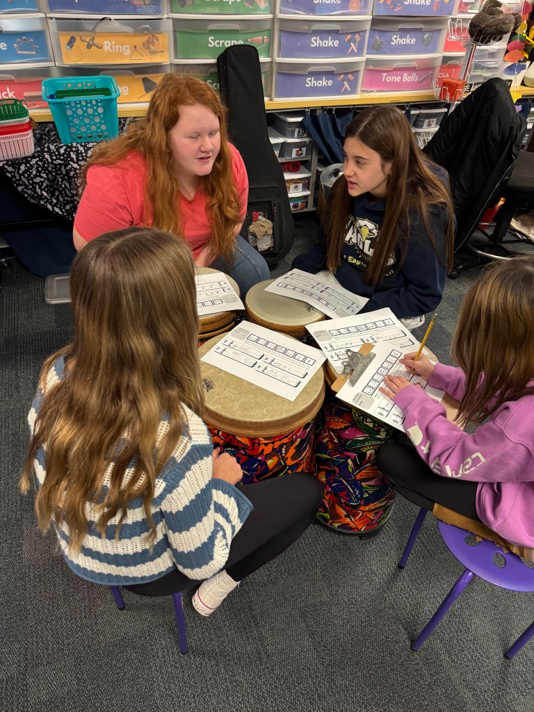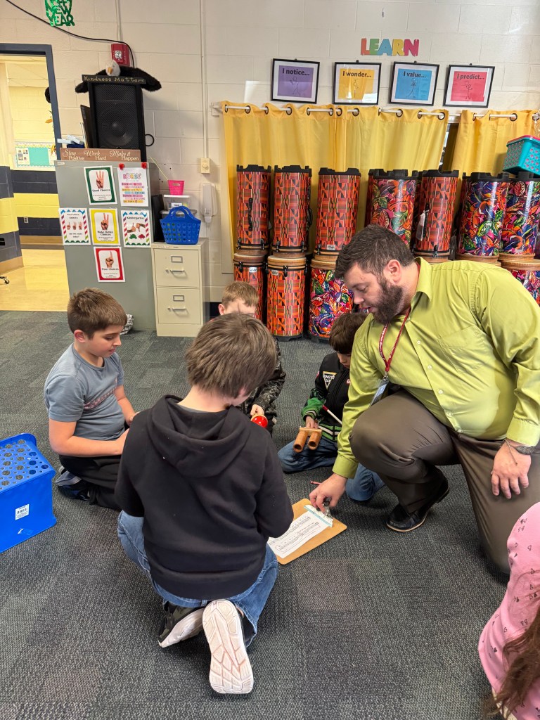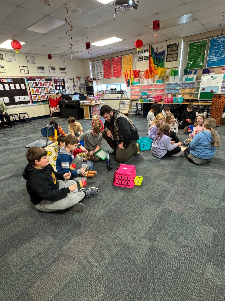 During my time as a student teacher learning from and working with Mrs. DeRemer I gained experience in multiple pathways to music education in including the Orff Schulwerk approach, the Kodály approach, World Music Drumming, and the philosophies of Dr. Feierabend. Through the lens of Mrs. DeRemers melded system I was able to integrate various aspects of each approach into my own teaching rudiment. Ever dependent on my love of creating and composing, I developed my own system of transmitting musical concepts via a narrative-driven system utilizing Ollie and other characters. My time at Wingate allowed me to further explore and adjust my teaching through this system. The students instantly fell in love with Ollie and would sing his songs in the hallways as I entered the school or ask me “Is Ollie going to be in class today?” Their anchored interest to the unfolding storyline was equally reflected in their music making. Grades K-3 specifically held deep interest in the world that they helped create and demonstrated daily their musical growth.
