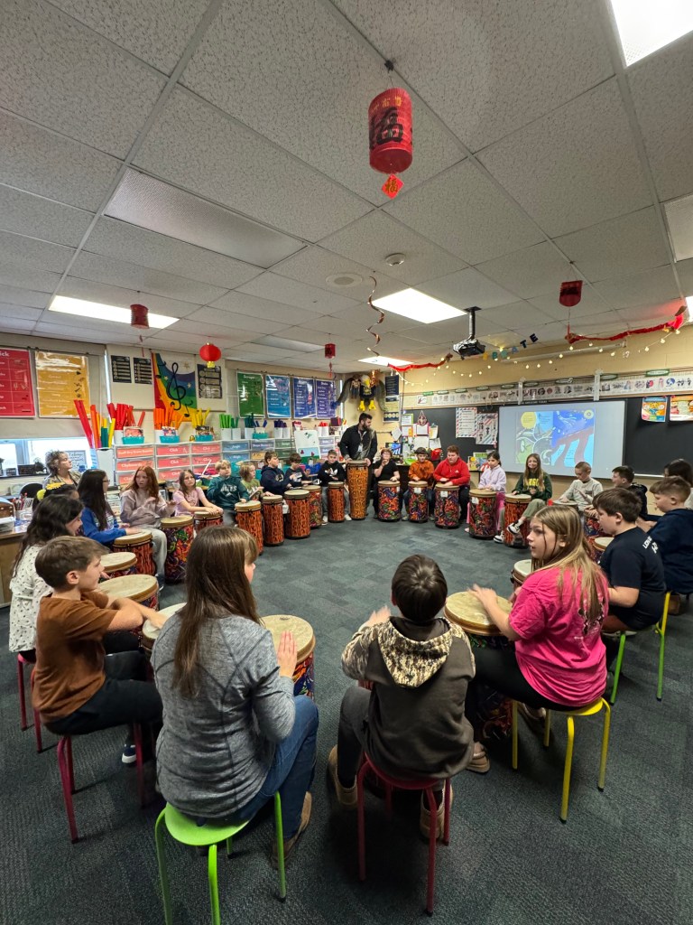 These classes discovered rhythms and a variety of musical styles of various cultures through the use of tabano drums. First with the reading of a book, The Drums of Noto-Hanto, they explored the transfer of vocal patterns to the drums through Taiko Drumming. The students improvised their own vocal and rhythmic patterns in call-and-response style play. Then they were tasked to create their own rhythms and long from pattern to perform as a small group. The students learned the complete form of a Matrsuri Taiko performance and performed it themselves. They explored more than the other grades through the lens of Aboriginal culture as well.