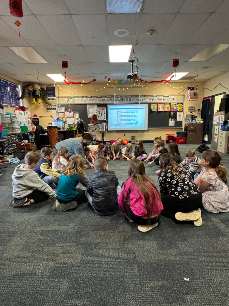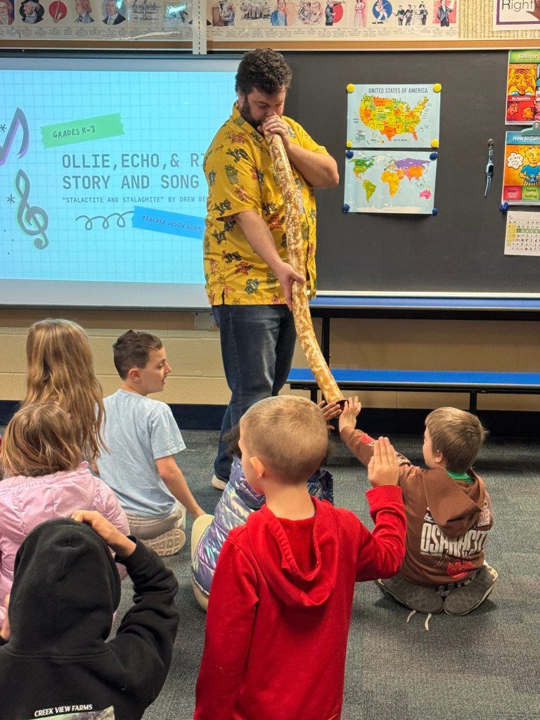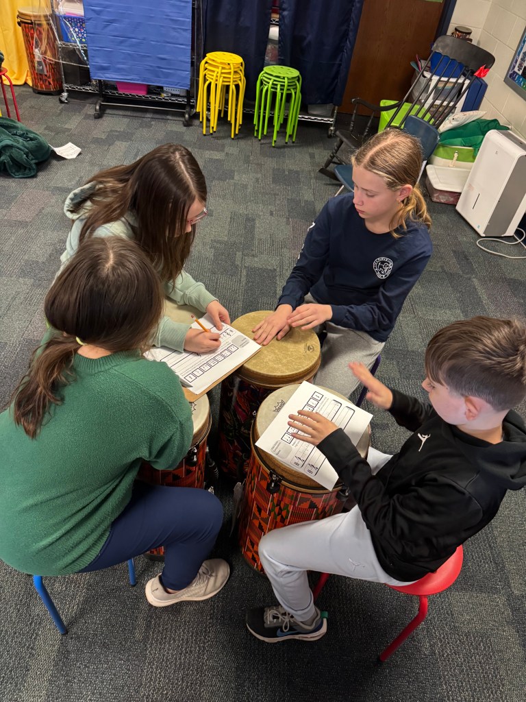 Each of the three classes of second graders were in such different places on their musical journey. While they followed the same general trajectory and lesson planning each group class had their own energy and took ownership over the flow of learning. The second grade language arts and world culture lessons of their regular class time allowed for great cross curricular collaboration. They learned about the country of Nigeria and explored the uses and music applications of the Gangan or “talking drum” and then the Aboriginal Australians and the Yidaki or “didgeridoo.” Through Ollies world, students focused their learning and creativity on a variety of musical concepts: steady beat, “Sol-Mi” identification and composition, notation reading (ta, ta-ti, ta-ah, rest and ta-ka-ti-ki), identifying “Do,” exploring dynamics, transforming rhyme to body percussion and instruments, performing in sections as part of an ensemble, types of voices, and singing in unison and as individuals.