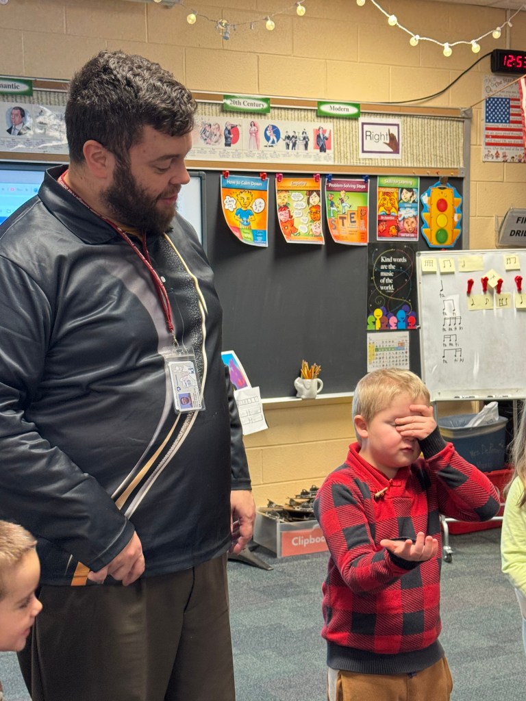 Kindergarteners are some of my favorite people. Students entered the classroom with a routine of singing “Engine, Engine # 9” as we march in circle around the room. Then let out a collective “Choo-Choo” to sit down. Other welcome songs are sung including, help from puppet friends Otto the Otter, and Rick the Raccoon, for a call and response of “In Any Kind of Weather.” And finally sign through a Solfeggio Elevator song with Curwen hand signs. Through Ollies world, students focused their learning and creativity on a variety of musical concepts: steady beat, “Sol-Mi” or “high-low” identification, preparing “Do,” exploring dynamics, types of voices, and singing in unison and as individuals.